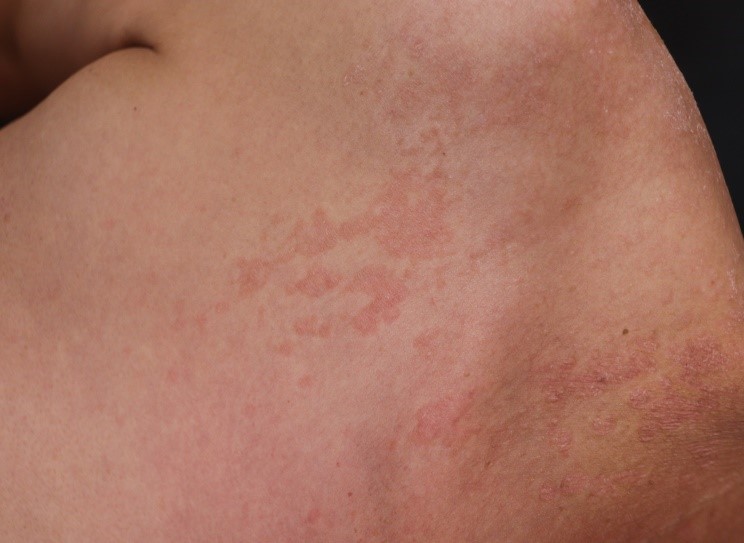 右圖:鎖骨有許多粉紅色的小圓丘疹,及匯聚而成的較大斑塊
