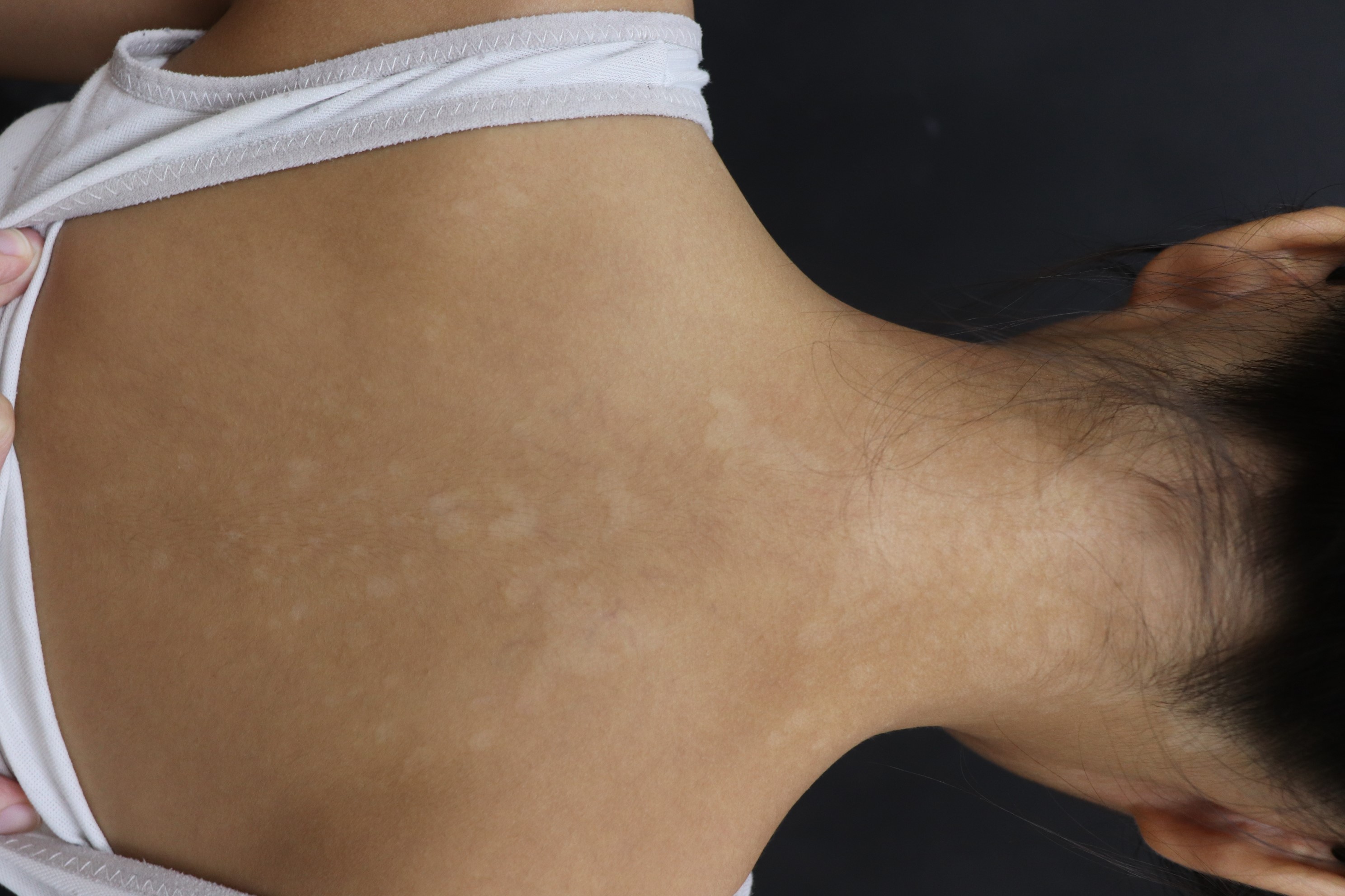 圖說:上背、脖子、下巴、前胸有許多白色的丘疹及斑塊,好發在易出汗及油脂分泌旺盛部位
