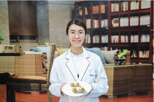 與營養科實習生一起設計這道可愛月餅的魏萌萱說,特別選用淨斯豆漿粉來取代和菓子原本甜膩的內餡,是因為豆漿粉富含優質蛋白質,而大豆脂肪是不飽和脂肪酸、維生素E的優質來源,不只熱量和脂肪較低、沒有膽固醇且含有低聚醣,對於肥胖的族群、高血脂、高血壓患者而言,是一種很好的食材。