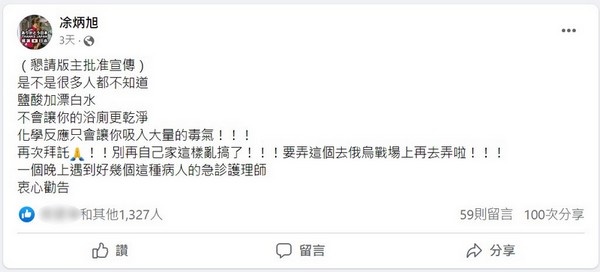 右圖:近來連續多日有民眾誤把同樣具有清潔力的漂白水與清潔劑混用,意外出現氯中毒的情形,急診值班的護理部副護理長凃炳旭特別於臉書在地社團發文提醒鄉親。