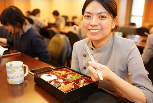左圖:常住志工顏靜曦表示,希望透過「素素平安健康餐盒」活動,讓同仁能從吃一餐素食開始,體會茹素的好處