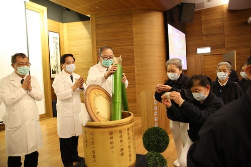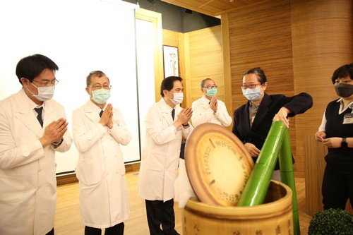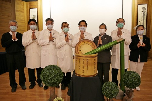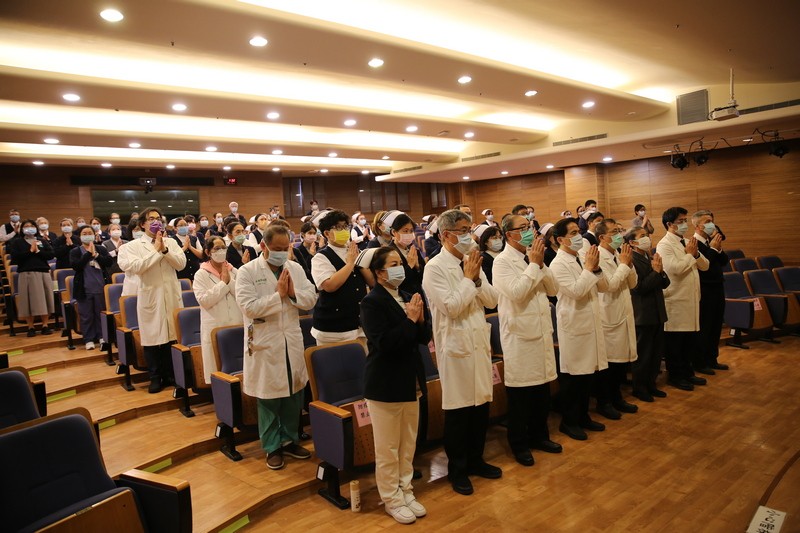 圖說(上、下):林欣榮院長、與許文林、吳彬安、何宗融、陳宗鷹四位副院長、陳星助主任秘書、常住志工顏靜曦、護理部鍾惠君主任等人帶領下,出席人員先為天下無災無難進行祈禱。