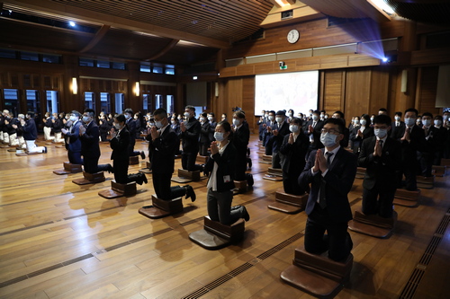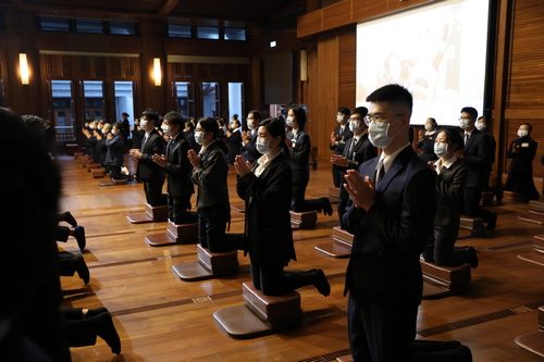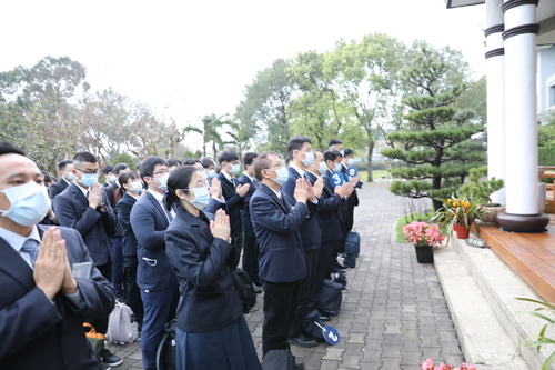 清晨六點,院長林欣榮與承擔學員長的醫務部主任吳雅汝醫師,與院長室主管及四十六位學員回到心靈的故鄉靜思精舍。副院長吳彬安、麻醉部陸翔寧主任、影像醫學部高鴻文主任、婦產部黃琦醫師承擔隊輔,第一堂課是從聆聽慈濟志工每天必須攝取的心靈資糧「志工早會」開始。