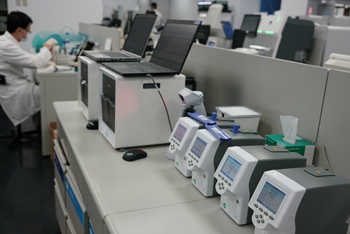 圖說(下):花蓮慈院檢驗醫學科備有高通量核酸檢測儀(PCR)(左),一次可檢驗上百個檢體,可加快發報告的速度,快速核酸檢測多台儀器(右)則可24小時不停機。