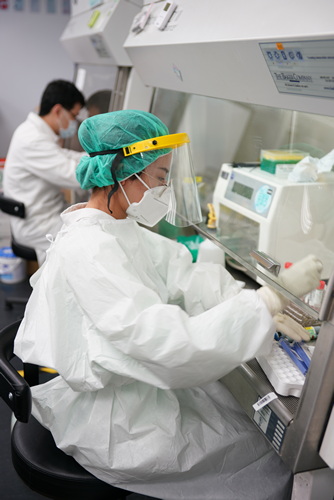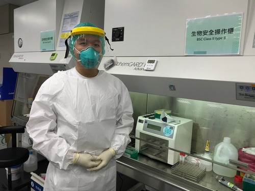 圖說(左):李怡萱醫檢師進行PCR檢驗,戴N95口罩、面罩、手套、穿著兩層隔離衣,操作高風險檢體,從檢體管內小心翼翼抽取檢體後加入試劑混和,每個步驟都要小心謹慎。(陳炳宏攝)