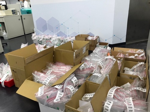 張淳淳主任說,當時休息室裡一貫性分裝作業,有的人負責滴試劑到收集筒內,有的人專做鎖蓋子的動作,有的人將試劑組套分裝到夾鏈袋內,因為量實在太大了,竟然有同仁的手指鎖蓋子磨到破皮,然後包著繃帶繼續做。回想起幾位高高瘦瘦的年輕男生,手指包著繃帶,形成一幅幅有趣的畫面,團隊真的很賣力。