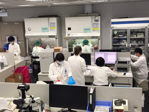 圖說(右):檢驗醫學科主任張淳淳與其他檢驗醫學科同仁,每周進行PCR篩檢。(陳炳宏攝)