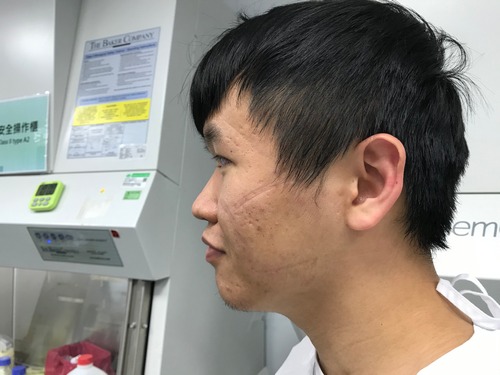 醫檢師長期戴面罩、N95口罩工作,兩頰都會出現壓痕。(檢驗醫學科提供)