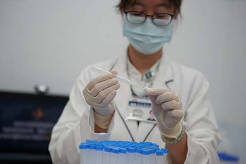 醫療快篩要求精準,為了確保檢體收集筒內的試劑量是足夠有效的,分裝試劑須由單位同仁逐一執行,滴入足夠的試劑量,再逐一鎖緊蓋子。讓人感動的是,不僅取消休假的同仁自動自發回到單位支援,就資源管理室的同仁們也紛紛義不容辭的來幫忙。