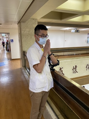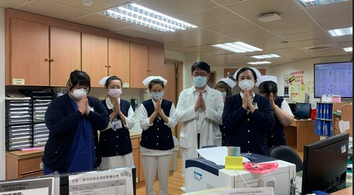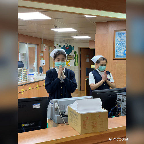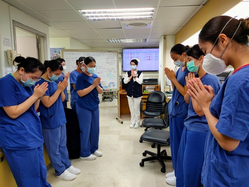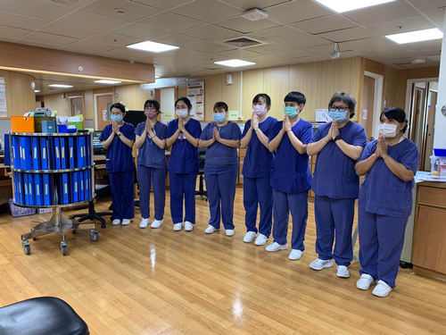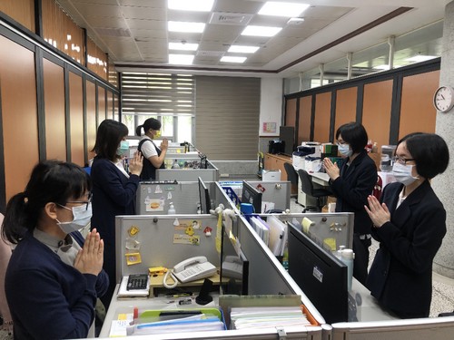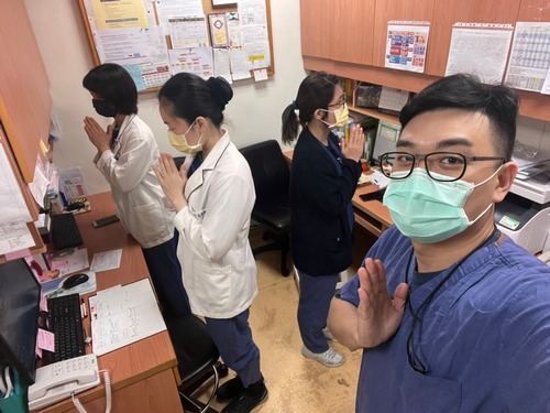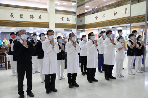 二十日下午一點二十分不到,林欣榮院長、副院長吳彬安、何宗融、主任秘書陳星助、醫務秘書李毅等院長室主管,護理部主任鍾惠君也帶領主管團隊,影像醫學部醫事放射科技術副主任陳懿芳及多位放射師、常住志工等已在大廳就定位。醫務部主任吳雅汝在協力樓辦公室帶領醫務助理、心血管暨粒線體相關疾病研究中心各國的研究同仁、各病房區,以及遠在同心圓的行政辦公室的同仁……在同一時間,等到祈禱的音樂聲響起,雙掌合十唱出心中的祈願。
