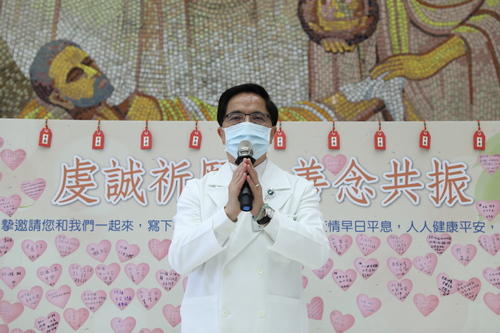 圖說(右):林欣榮院長表示,新冠肺炎疫情已有二年多,希望同仁藉由每天下午虔誠的祈禱,讓自己的心平靜,時時刻刻做好防護,期盼Omicron病毒盡速遠離,人人都能保平安。