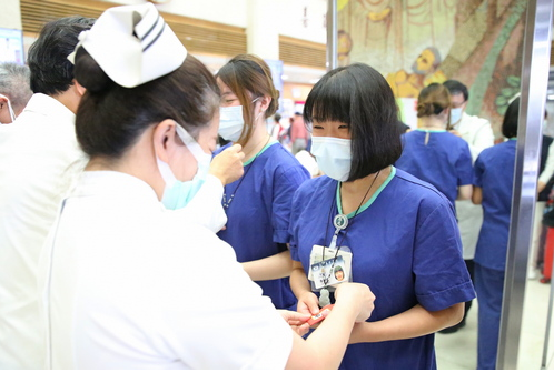圖說(左):院長室及護理部主管,為團隊戴上觀世音菩薩佛像,並致贈祝福包,祈願同仁順利平安完成任務。(江家瑜攝)