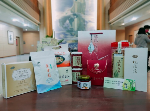 圖說(右):十全十美平安祝福包裡有「上人祝福信、靜思語、靜思本草飲濃縮液、香積飯、香積米粉、海苔素香鬆、福慧珍粥、淨斯豆漿粉、五穀餅乾、薑黃醬」(劉明繐攝)
