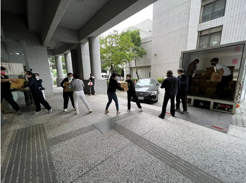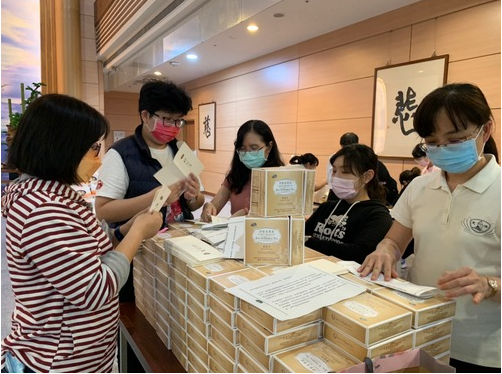 圖說:護理部、人文室等許多單位同仁及常駐志工在十七日下午完成打包生活補給品及心意。(左圖徐玲玲攝、右圖王琬詳攝)