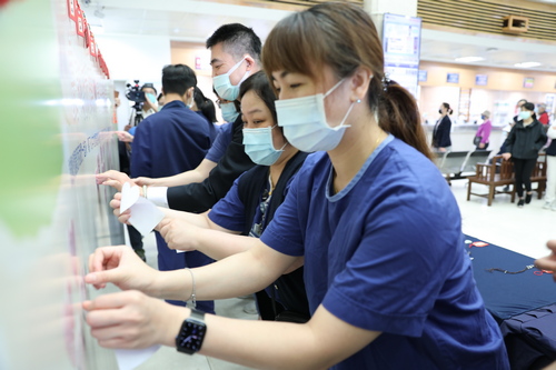 早上到院看診的曾小姐表示,現在疫情緊張、加上國際上有戰爭,所以祝福卡寫下「天下無災無難世界祥和」,曾小姐也表示,醫師與護理師在這波疫情中不眠不休守的在第一線,看了內心十分不捨,尤其世界與病毒都驟變,更應給他們信心與力量,才有支撐下去的勇氣。
