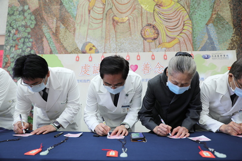 四月十八日上午八時三十分,祈願牆啟用儀式在「愛與關懷」的祈福歌聲中揭開序幕。院長林欣榮、副院長許文林、陳宗鷹、吳彬安、羅慶徽、徐中平、何宗融、主任秘書陳星助、醫務秘書李毅,護理部主任鍾惠君、副主任王淑貞、葉秀真、呂基燕、王琬詳,以及醫事室副主任張菁育等多位主管及同仁代表參加。慈濟基金會林碧玉副總也特別撥空與會,致詞鼓舞同仁。