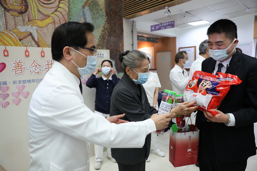 為了祝福進駐加強型防疫旅館的照護團隊,林碧玉副總與林院長等主管,逐一為「防疫英雄」戴上上人的祝福「觀世音菩薩佛像」以及十全十美平安祝福包。祝福包裡有「上人祝福信、靜思語、靜思本草飲濃縮液、香積飯、香積米粉、海苔素香鬆、福慧珍粥、淨斯豆漿粉、五穀餅乾、薑黃醬」,是上人給防疫家人們最大祝福,也是人文室同仁及常駐志工在十七日下午完成打包生活補給品及心意。