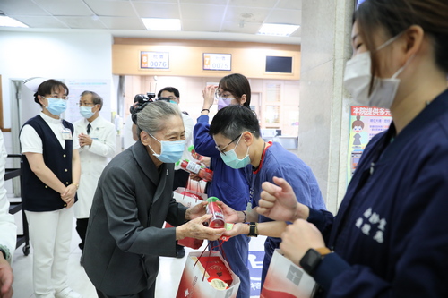 圖說:慈濟基金會林碧玉副總與林欣榮院長,特別致贈羅慶徽副院長與護理師同仁象徵平安健康的蘋果。(陳安俞攝)