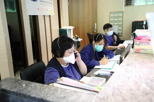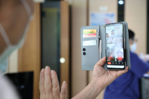 「身體感覺怎麼樣?還好嗎?」在加強型防疫旅館裡,也有幾位確診的同仁住在其中,羅慶徽副院長與鍾惠君主任、周英芳督導透過手機視訊即時連線關心同仁。