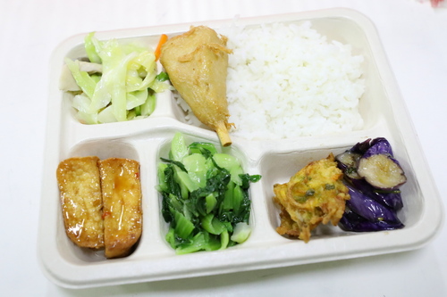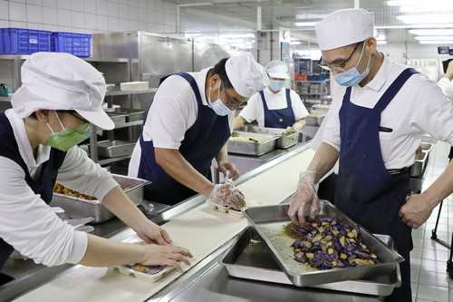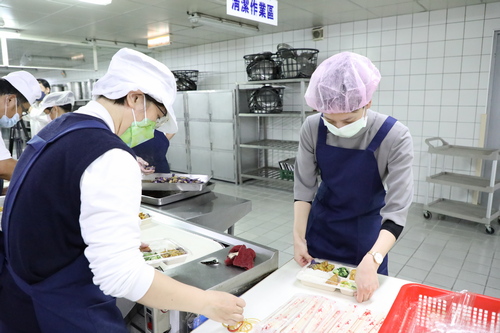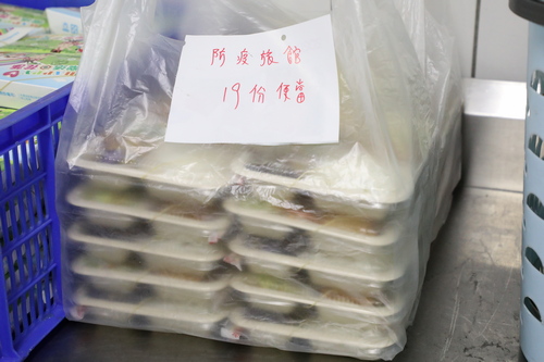 四月二十日上午,同心圓餐廳裡,供膳組組長「江姊」江月貞帶領廚師們以及來支援的人力資源室同仁站成兩排,動作迅速的分裝便當,秀色可餐的菜色中,連志工團隊為同仁特別做的「加菜」都沒落下,一起被裝進便當盒裡,江姊表示,雖然同仁人在防疫旅館,也要將志工們的心意送到他們手中。總務室主任沈芳吉說,便當每道菜都兼顧營養與色香味俱全,希望讓同仁們及住民都能吃的健康又歡喜。