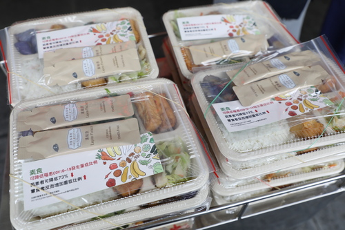 送餐的交通車出發前,護理部鍾惠君主任與沈芳吉主任把握時間,包裝推素小卡,小卡上分享美國約翰霍普金斯大學研究團隊的發現「素食可降低罹患COVID-19發生重症比例,尤其茹素者可降低73%」,希望讓住民更了解素食的優點。