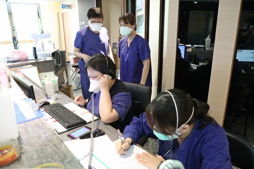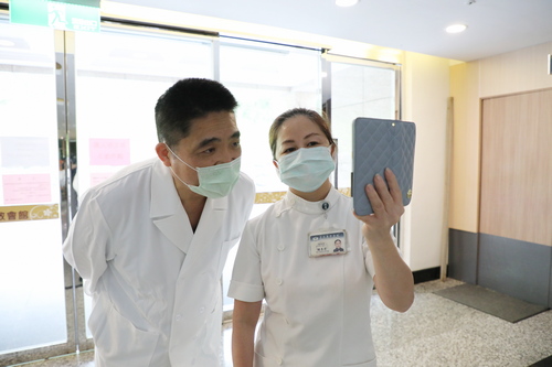 圖說:羅慶徽副院長與鍾惠君主任、周英芳督導透過手機視訊即時連線關心同仁。