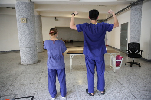 「醫療快篩組到這邊、行政後勤支援到那邊」二十二日悶熱的午後,靜思堂前已搭建好遮陽避雨的棚子,並裝上了燈泡,裡頭的快篩團隊正分組熟悉動線與流程,一旁還有總務室、人文室、人資室、慈濟基金會總務處同仁,不停來回穿梭協助場布,椅子、桌子、報到處電腦路線、工作人員休息區等一一就定位;另外,借鑑其他醫院承接快篩站,幾乎每日都會篩到陽性確診者的經驗,團隊也特別邀請感染管理控制室江惠莉組長,先帶著同仁演練防護衣正確穿脫方式,來降低染疫風險,確保同仁在執行任務時,都是安全無虞外,也做採檢技巧實務訓練。