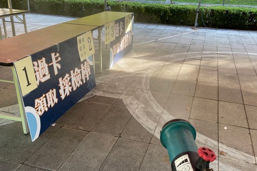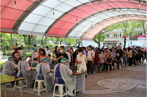 快篩站開站首日,藍天白雲,豔陽高照,隨著氣溫逐漸升高,排隊快篩的人潮也逐漸增加,不到十點,就有不少民眾來排隊,團隊見狀,立刻提前到十點四十五分就開始服務鄉親,而排隊的隊伍,也從靜思堂一路排到社服室旁的人行道上,為了紓解排隊人潮及縮短鄉親的等候時間,篩檢站也由三線增加到四線。