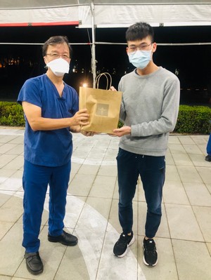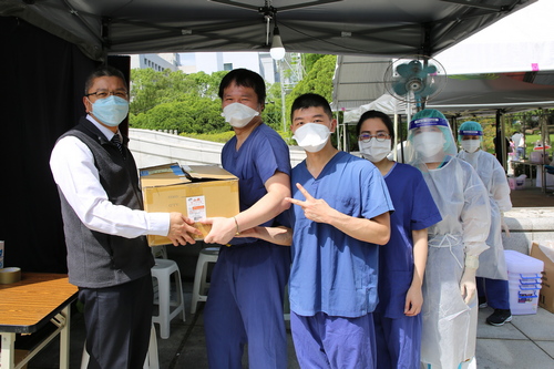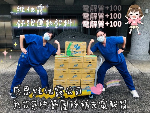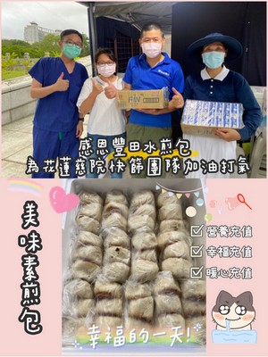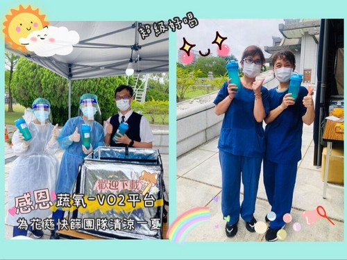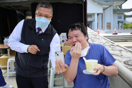 除了精舍,還有院部主管及各地湧入的祝福與補給,包含林欣榮院長與夏玉心師姊為他們準備每日的幸福晚餐、護理部主任鍾惠君送上補充能量飲、遺傳諮詢中心主任朱紹盈送來清涼冰淇淋、品管中心副主任林雅萍帶來能量飲,還有維他露公司、豐田水煎包、自由打字行、蔬氧-VO2平台等為團隊送上滿滿的元氣補給品,讓快篩隊忍不住直呼「雖然辛苦,但很幸福。」