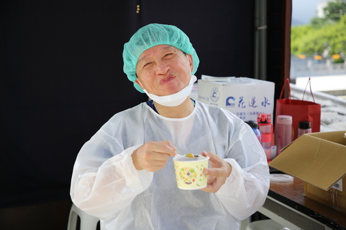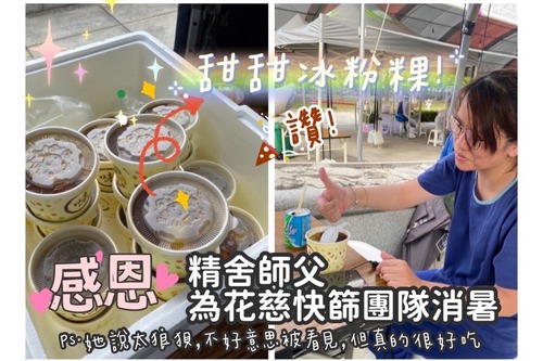 「今天也要元氣滿滿」在這連續七天的硬仗裡,團隊也在聯繫工作的群組裡互相加油打氣外,還有來自靜思精舍德愉師父每日準備的涼品甜點,最受同仁喜愛與期待。吃著紅豆地瓜圓仔湯的李毅說,天氣太熱,沒吃午餐,渾身是汗,正值「飢暑交迫」,隨手拿一碗入口,哎呦!那清甜涼爽的滋味,還真有如沙漠中的甘霖,紅豆軟嫩,入口即化,渾圓飽滿的地瓜圓仔,Q嫩彈牙。紅豆的軟,圓仔的Q,搭配得剛剛好!