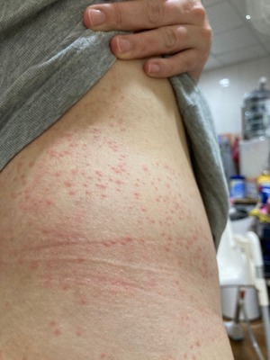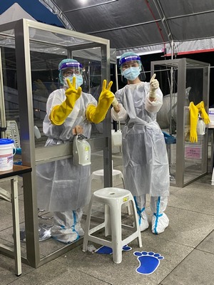 這一週的天氣晴空萬里,快篩隊每人身著密不透風的防護裝備,蒸發不了的汗水,在脫下裝備時像瀑布般流下,雙手也因為浸在汗水中的時間過長,泡得發白,還有同仁因為頻頻使用酒精消毒雙手,導致洗破手,由團隊護理師緊急先用封箱膠帶包裹傷口;層層防護裝備下的衣服更是沒有乾過,身體也因此悶出了紅疹外,還有花蓮特產俗稱「黑金剛」的小黑蚊,在周圍伺機而動,抓準時機叮咬同仁,劉曉諭主任說,面對這些困難與不適,大家都是以愉快的心情來面對,尤其這次來支援的急診醫師鍾葛鈞,悶熱及高溫下的採檢導致中暑,醫秘李毅及時上場補位救援,看著團隊不分彼此合心完成任務,真的很感動。