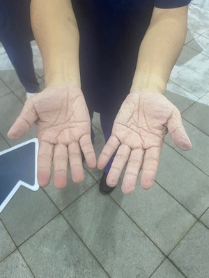 圖說:快篩隊每人身著密不透風的防護裝備,蒸發不了的汗水,在脫下裝備時像瀑布般流下,雙手也因為浸在汗水中的時間過長,泡得發白,身體也因此悶出了紅疹。