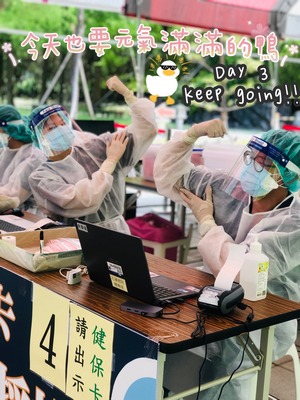 劉曉諭主任分享,快篩站第二天,有位姊姊帶著五個弟弟、妹妹來做快篩,但一人無法同時顧到這麼多的孩子,弟弟妹妹們在快篩站到處奔跑穿梭,無法乖乖坐著篩檢,負責採檢的小兒科蕭宇超醫師見狀,走出採檢屏風先陪孩子們玩了一陣子,建立彼此信任後,小朋友們才願意被篩檢,事後團隊也詢問蕭宇超醫師這樣採檢是安全的嗎?蕭宇超醫師則說,面對這樣的孩子,這是最合適也能快速的為他們採檢的方式,而他自己也做好相關的防護措施準備,不用太擔心!這分愛心與體貼心,真的令人動容。