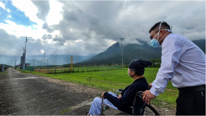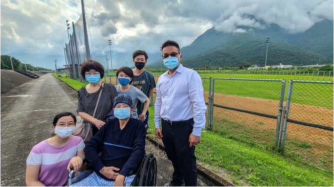左圖:四月二十七日下午,天氣清朗,劉冠麟醫師(右一)、吳雅汝醫師(左一)帶著許永祥主任一家人到球場,那天許主任的精神特別好。(林永森攝)