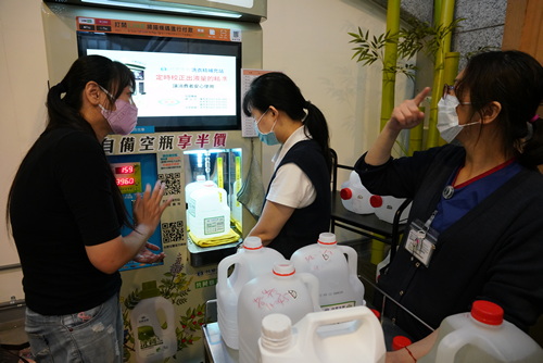 謝婉華理事主席指出,環保洗衣精1公升40元,一年大約可節省4000支大塑膠瓶,相當於減少1,363公斤碳排放量,560公斤塑料使用,慈濟大學與花蓮慈院裝設環保洗衣精自動販賣機,主要是為了推廣環保減塑生活。
