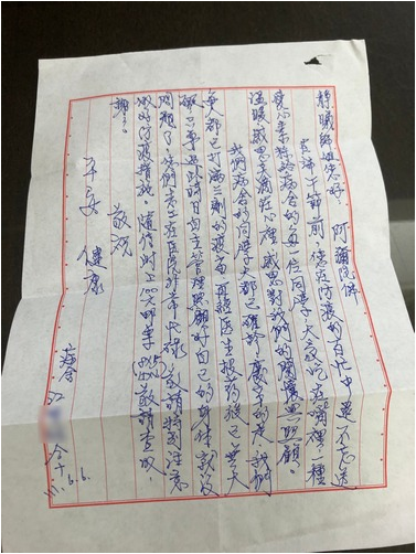 儘管這兩三年,年節關懷因疫情無法進入拜訪,但年節禮物沒有間斷,在冬天,也會送厚衛生衣褲給收容人加強保暖。顏靜曦師姊還說,六月一日送端午節素粽到花監病舍,不久就收到江姓收容人的信及郵票捐款,感恩慈院的關懷與照顧,令她記憶深刻,也讓她在第一時間想到花監病舍可能需要血壓計、血氧計。