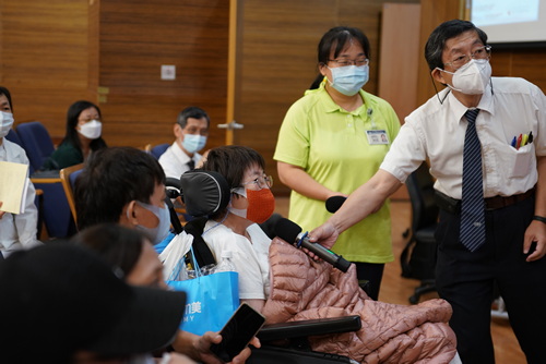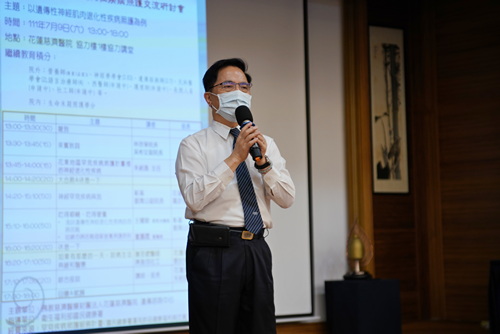 除罕病病友、醫師、護理師、社工、營養師、復健醫學部治療師外,還有長照人員與罕病關懷志工,實體加上線上共七十餘人與會,院長林欣榮蒞臨致詞。