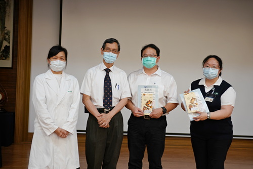 圖說(右):朱紹盈主任與彰基劉青山副院長(座長)致贈結緣品給語言治療師王耀毅與童麗霞營養師,感恩他們的分享。