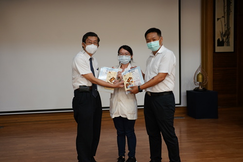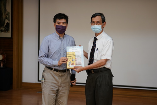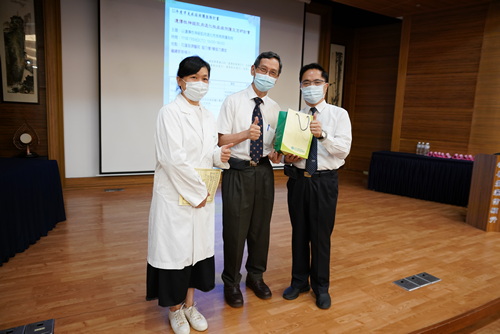 圖(右):座長劉安邦主任致贈結緣品給謝至鎠主任與陳盈羽社工師。