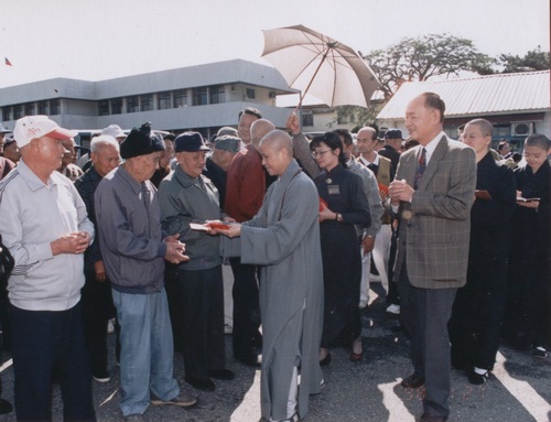 左圖:一九九七年大年初一, 證嚴上人由當時榮家主任呂興武陪同,帶領慈濟功德會志工與常住師父到榮家慰問榮民,並致贈每人福慧紅包。(花蓮榮家提供)