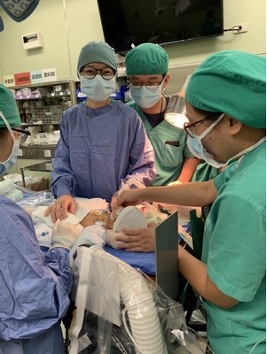 左圖:兒童外科楊筱惠醫師(右)與彭海祈主任(左)於七月十五日為新生兒進行左上肺葉切除手術。(鄭偉君攝)
