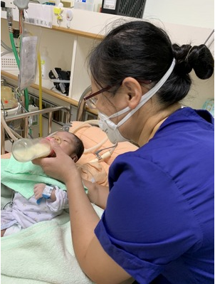 圖:術後第三天,護兒中心副護理長陳怡汝幫忙餵奶,寶寶吸奶順暢。(鄭偉君攝)