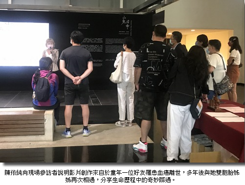 陳依純補充說明,因為小時候,一位跟自己每天一起上學的好友生病了,從她突然不能來上學,突然她的頭髮不見了,到後來消失離開了,對年幼時期的她們來說,生命的議題太衝擊也太沈重,沈重到她內心的恐懼,深埋了三十多年,一直對死亡傷痛害怕的陰影。後來她知道好友罹患的是白血病,但另一個不了解,是為什麼當時她的雙胞胎姊不能救妹妹,這些心裡的疑問直到認識了慈濟,實際參訪了骨髓資料庫,造血幹細胞收集室與移植隔離病房,才了解什麼是造血幹細胞、第六對染色體基因配對與移植時需要的歷程,她心裡的困惑才豁然開朗。