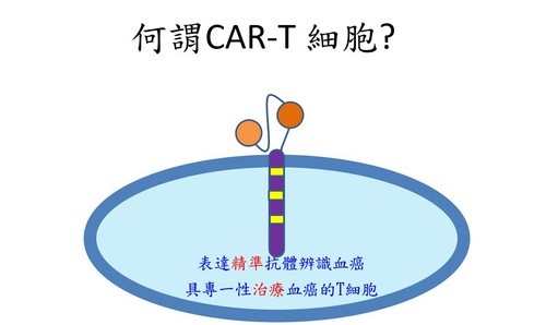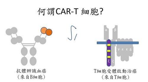 正常的T細胞,的確可以稍微辨識、攻擊癌細胞,但T細胞非常忙碌,又要對付細菌、病毒與老化基因,忙碌到沒有辦法完全控制癌細胞。如果對T細胞進行基因改造,加上能高度辨識癌細胞的B細胞基因,特別是針對某些血癌細胞增加辨識度並啟動成為CAR-T(細胞嵌合抗原受體T細胞(chimeric antigen receptor T cells, CAR-T cells),就能克服難治的血癌。