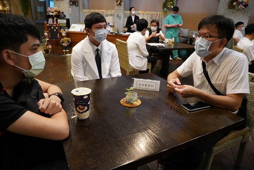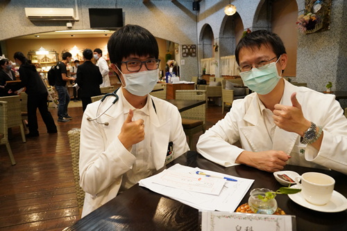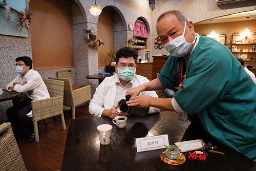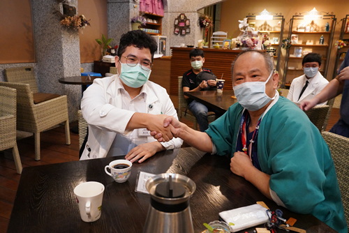 圖:麻醉部陸翔寧主任(右)親自為PGY翁宗睿倒上熱咖啡。