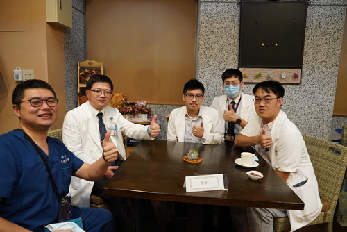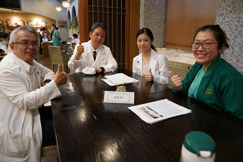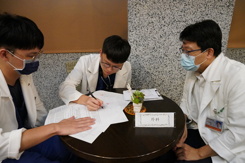 圖(左):婦產部丁大清主任(左二)與高聖博副主任(左一)、陳姵辰醫師(右一)一起與PGY(右二)面談。