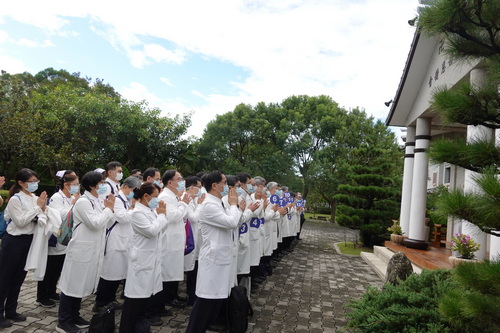 圖:二十五日一早院長林欣榮(左圖右一、右圖前排左一)帶領下,學員前往靜思靜思精舍展開主管合心共識營一天充實課程。(廖文聰攝)