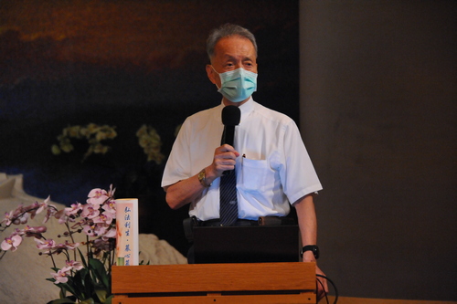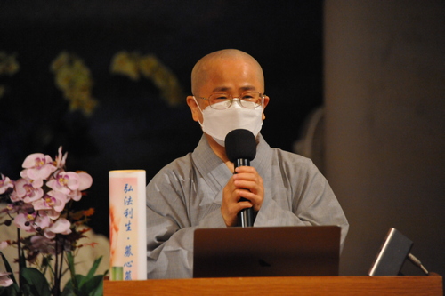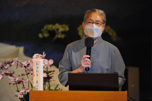 圖: 德宸師父以「無量義融法髓」為題,分享 上人精髓「無量義經」,及防疫靈方妙藥茹素。(廖文聰攝)