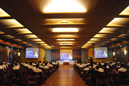 今年的主管合心共識營有林欣榮院長及院長室、大醫王、白衣大士、醫技、行政等單位主管一百一十五位學員人與二十四位工作同仁參加,由牙醫部特殊需求者口腔醫學科主任李彝邦擔任學員長,上午八點三十分準時開始,先由醫療法人執行長林俊龍、以及林靜憪(碧玉)副總致詞期勉揭開序幕;第一堂課,由德宸師父以「無量義融法髓」開示。