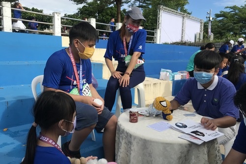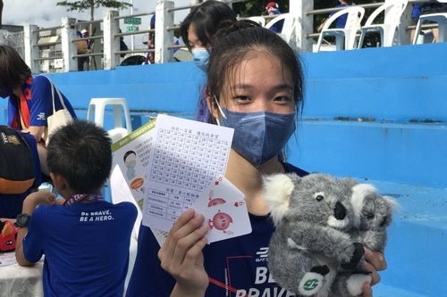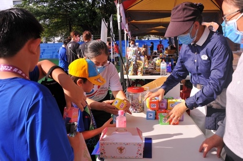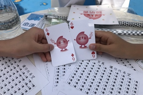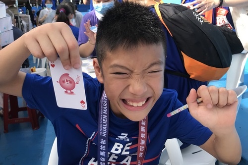 來自東大附小三年級的孫同學跟廖同學,跑完十公里路跑後就前來骨髓幹細胞中心的攤位,挑戰桌遊,成功配對上時,忍不住洋洋得意起來現場歡呼,兩個小朋友一再挑戰,慈青姊姊認真說明,希望他們能了解且支持造血幹細胞捐贈救人的善行。
